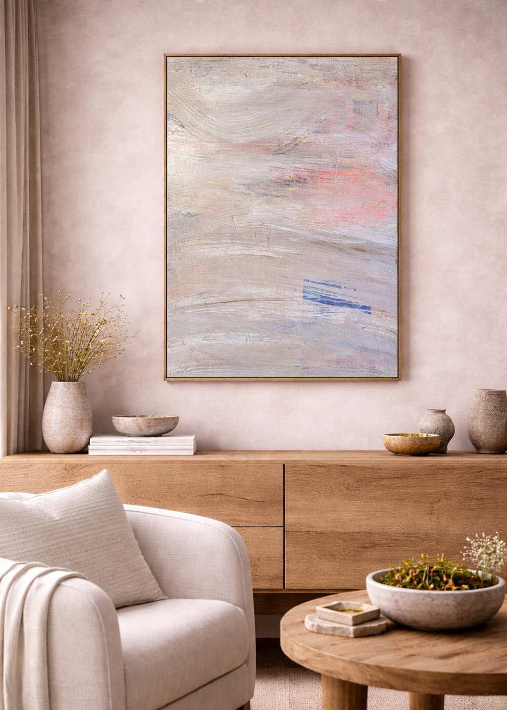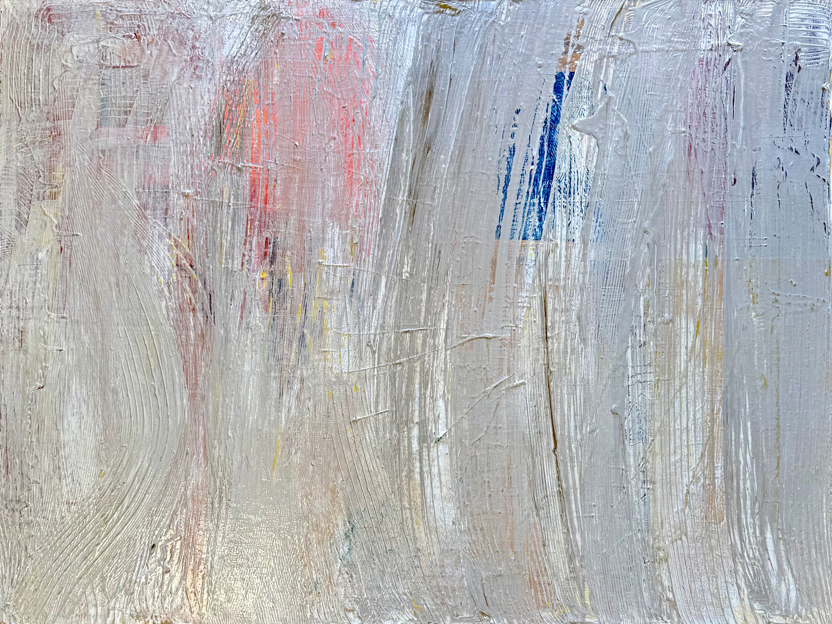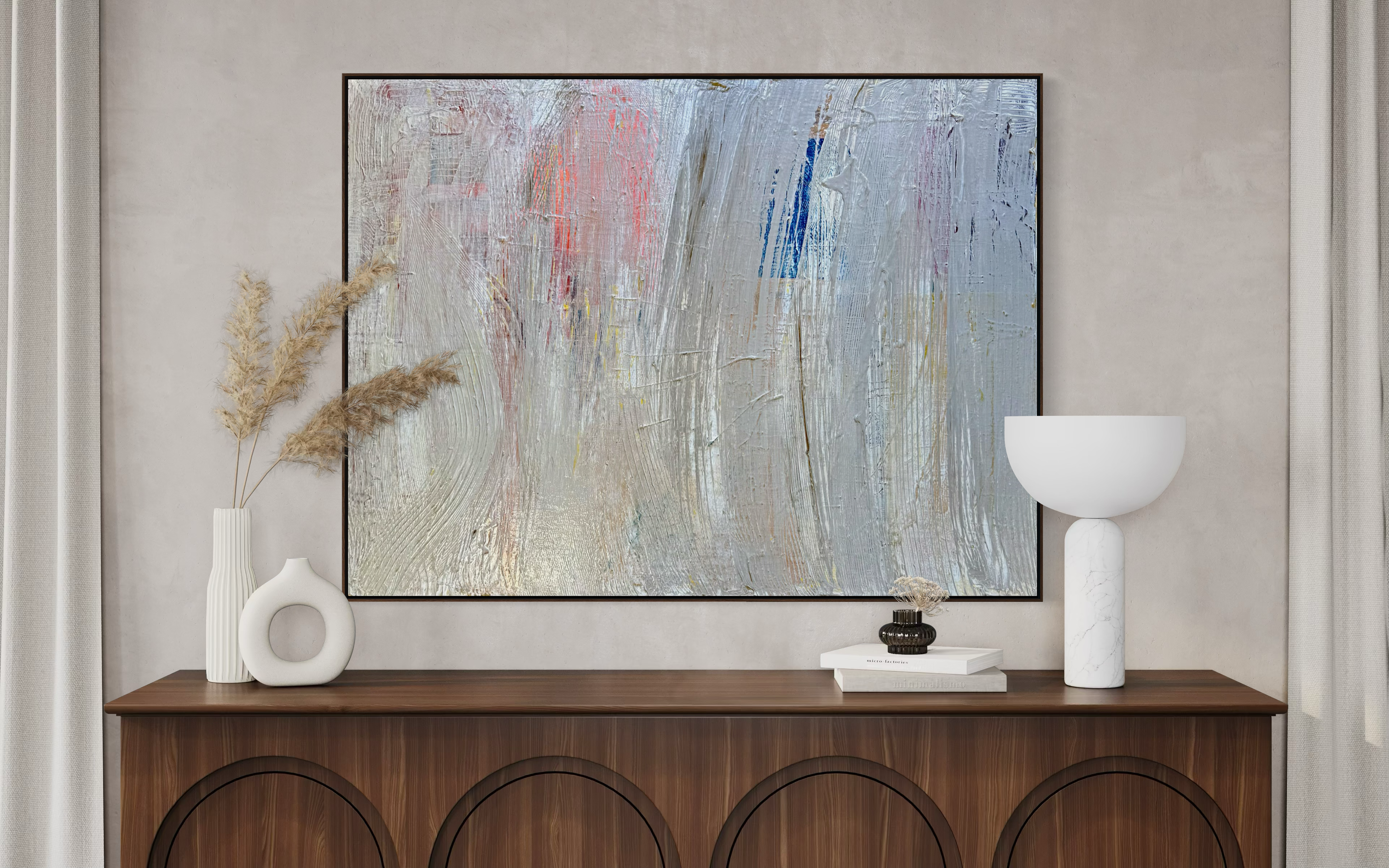 After the Storm captures the quiet moment of stillness that follows turbulence. Layers of soft whites, pale blues, and muted neutrals sweep across the canvas in vertical movements, suggesting rain, wind, and the slow clearing of the sky. Subtle flashes of coral, yellow, and deep blue emerge through the textured surface like traces of light breaking through clouds. The painting balances energy and calm, with thick, expressive brushwork revealing the physical movement of paint while maintaining an overall sense of softness and atmosphere. The result is a contemplative landscape of emotion—an abstract reflection on renewal, clarity, and the calm that arrives once the storm has passed.