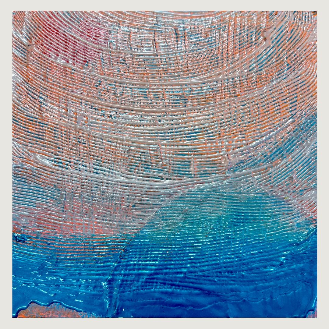 ],"description": "Electric Wave (12 x 12 inches)Collage, Acrylic, Aerosol\n\nElectric Wave captures the vibrant energy and rhythm of motion through layered, radiating textures that ripple across the canvas. Warm coral tones merge effortlessly into cool ocean blues, creating a dynamic push and pull between heat and tranquility. The carved, circular grooves give the surface a pulsing, wave-like vibration, as if sound, light, and water are moving in sync. Glossy acrylic layers intensify the luminosity, making the piece feel alive and electric—an abstract seascape charged with color and movement.","brand": {