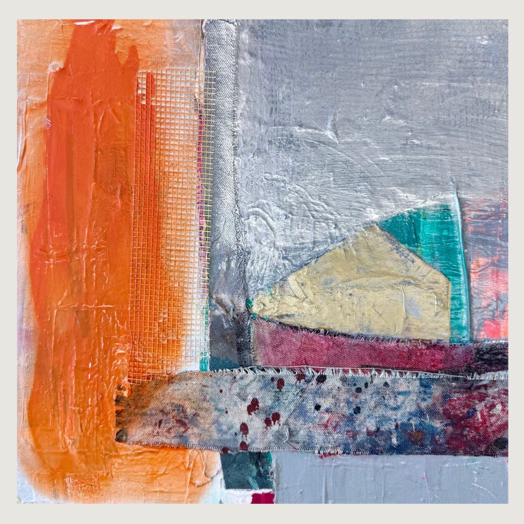 ],"description": "Ember \u0026amp;Steel (12 x 12 inches)Collage, Acrylic, Aerosol\nThis 12x12 collage painting layers acrylic and aerosol with sculptural textile elements to create a striking interplay of warmth and structure. A bold vertical sweep of ember-orange anchors the left side, contrasted by cool metallic silvers and teal planes on the right. Mesh, frayed fabric, and textured gel give the work a tactile, architectural feel, while splattered marks add a sense of spontaneity. The composition feels like heat pressing against metal—dynamic, energetic, and balanced by quiet geometric order.","brand": {